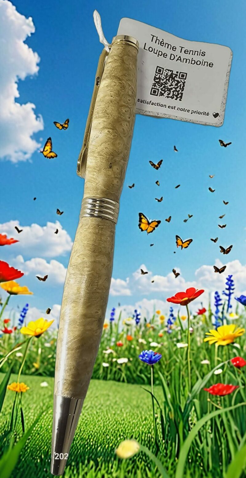 Stylo à Bille en Loupe d’Amboine – Thème Tennis – Fait Main